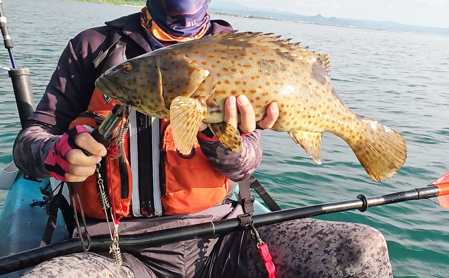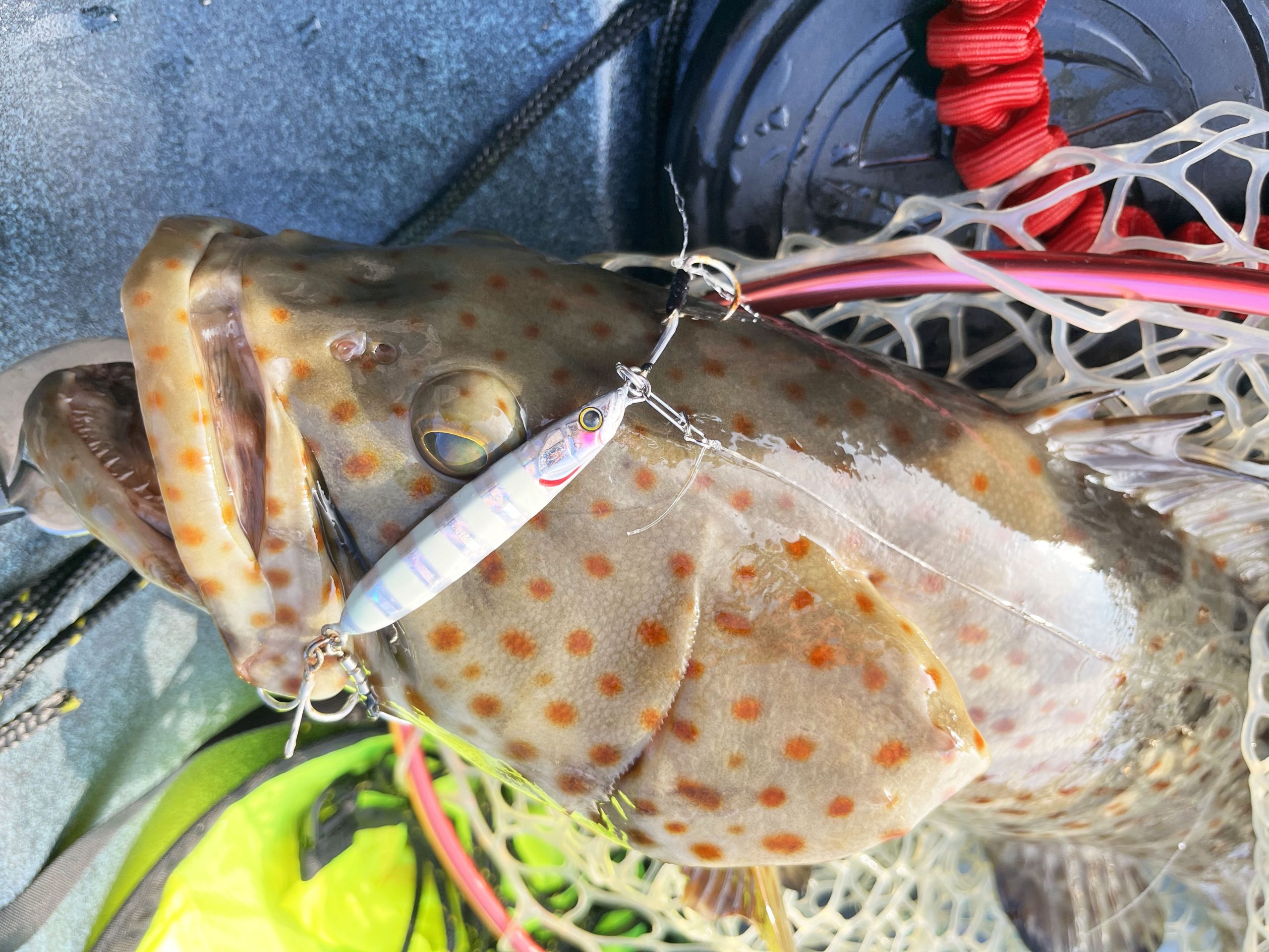 体全体に瞳孔サイズの茶褐色・赤褐色の斑が散在し、体側に薄い斜めの暗色帯があるのが特徴の大型ハタです。全長1m以上になることがあり、琉球列島などの南日本からインド太平洋域の熱帯・亜熱帯域に生息します。