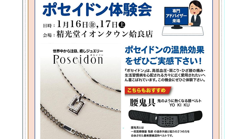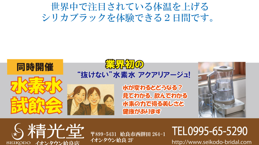 2026.1.8 Blog 毎年恒例。 Tweet みなさんおはようございます 精光堂イオンタウン姶良です(^^♪ 来週末は 毎年恒例の 健康体験イベントやります(*´▽`*) シリカブラックの温熱効果と 抜けない水素水アクアリアージュの試飲会です!